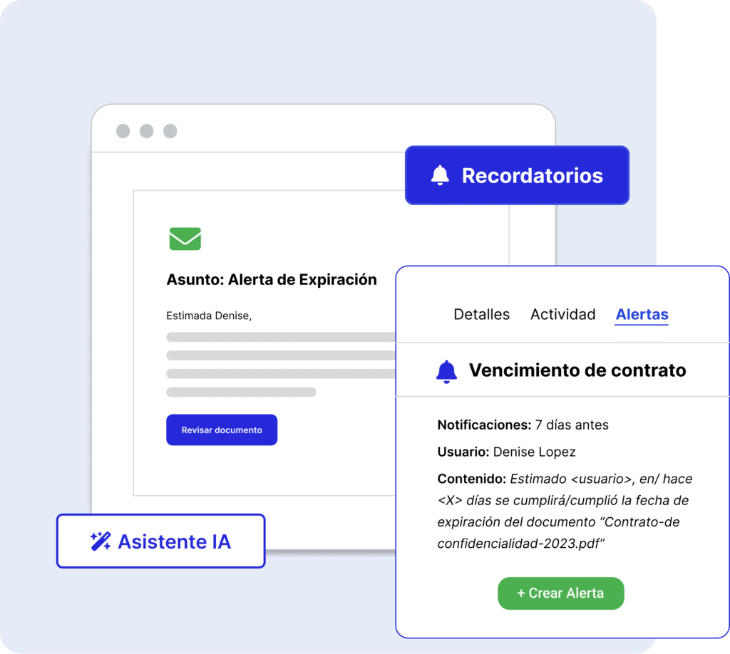 Configura alertas y notificaciones para recibir recordatorios sobre fechas clave, como vencimientos y renovaciones de contratos. Esta funcionalidad asegura que no se pase por alto ningún hito importante en la gestión de tus contratos, manteniendo todo bajo control.