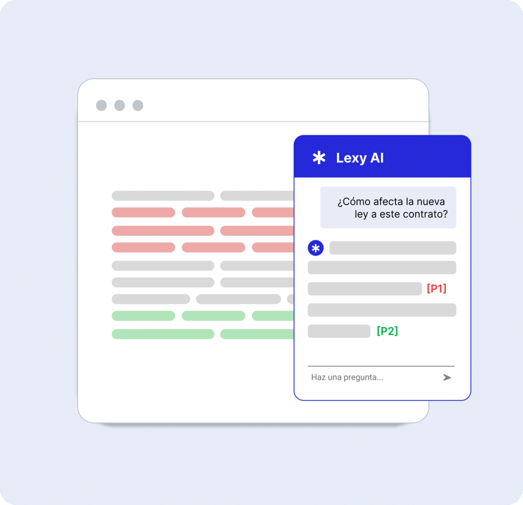 Realiza búsquedas en lenguaje natural sobre el contexto y propósito de tus documentos legales para encontrar rápidamente la información relevante dentro de tu base de conocimientos legales y resuelve cualquier duda con Lexy, tu asistente legal.